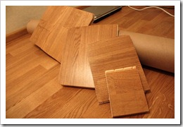 Для начала из остатков паркетной доски я электролобзиком выпилил полки. Заметьте, что полки сделаны разного размера: самая большая будет на самом верху и ее площади достаточно, чтобы тело кошки на ней уместилось без проблем; самая нижняя – самая маленькая, чтобы кошка могла спускаться по ней, так как прыгать она не любит.